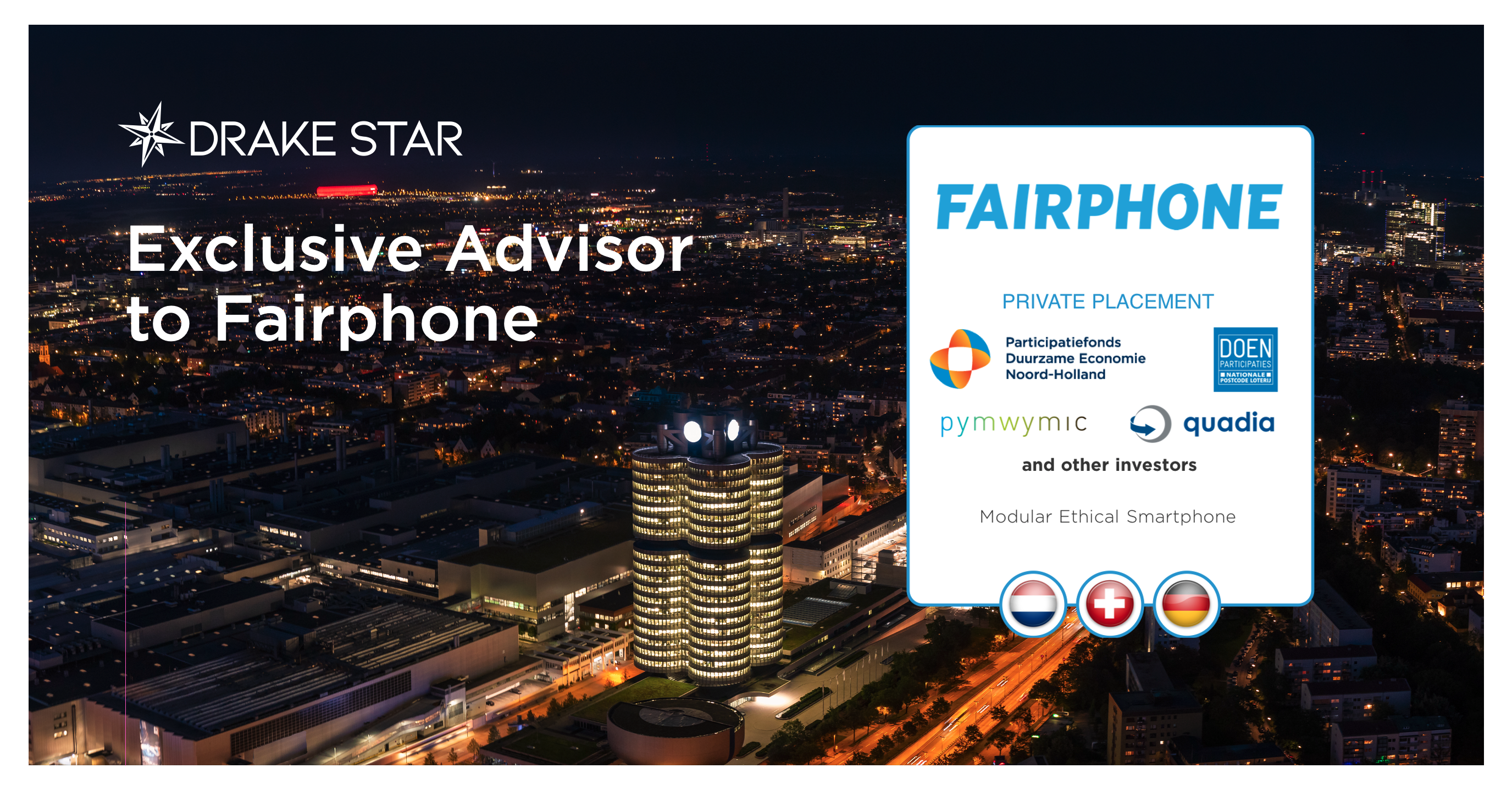 AMSTERDAM | December 11, 2018 – Fairphone has successfully raised a major round of investments. The mission-aligned funding comes from lead investor PDENH, impact investor Quadia, existing Fairphone investors DOEN Participaties & PYMWYMIC, and other investors. Drake Star Partners acted as the exclusive financial advisor to Fairphone in this transaction.
