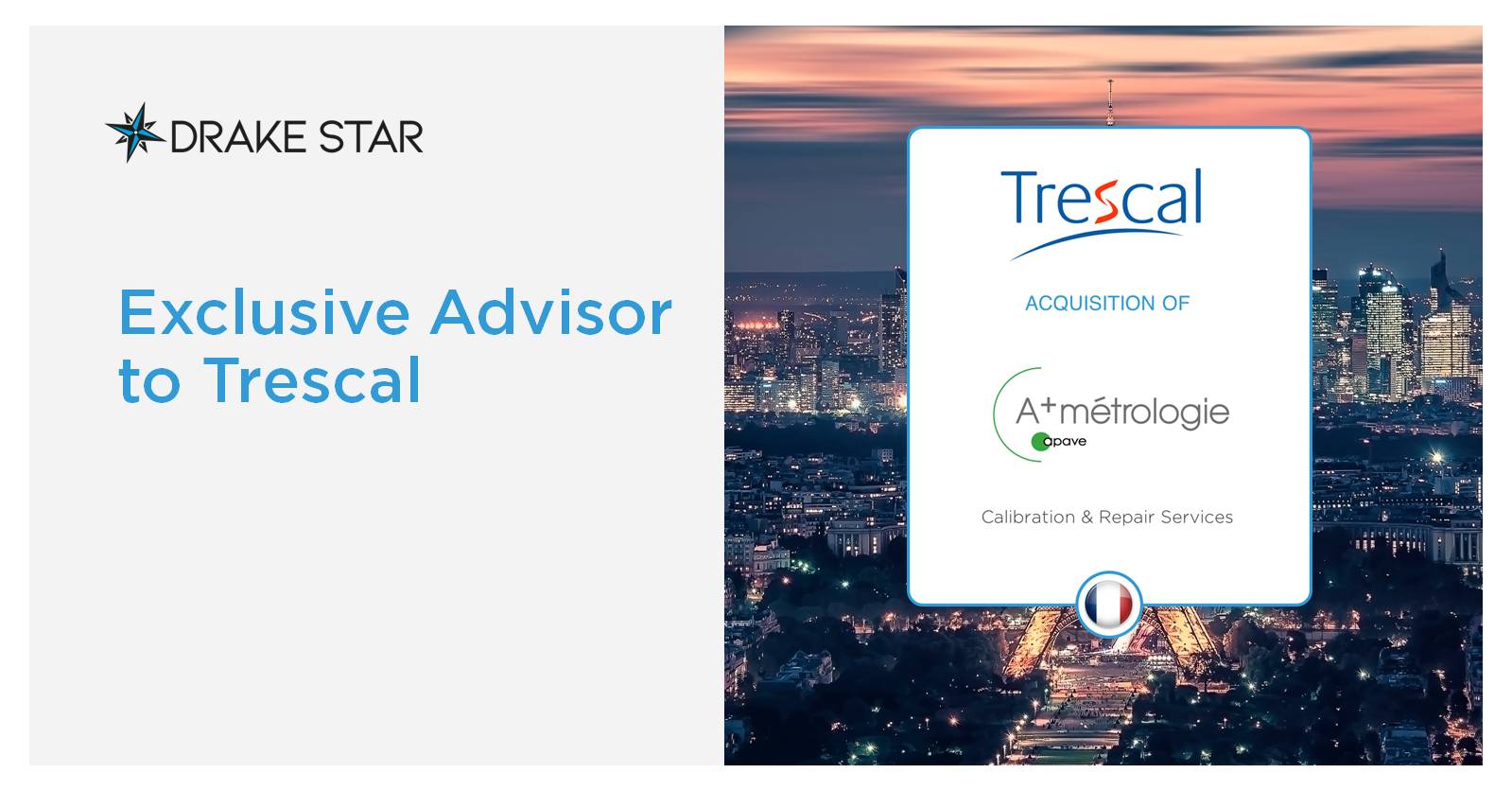 PARIS | November 2, 2017 – Trescal announces today that it has successfully completed the acquisition of A+ Métrologie, a subsidiary of the APAVE Group and a major player in the French test and measurement market. Drake Star Partners acted as the exclusive buy-side advisor to Trescal in this transaction.