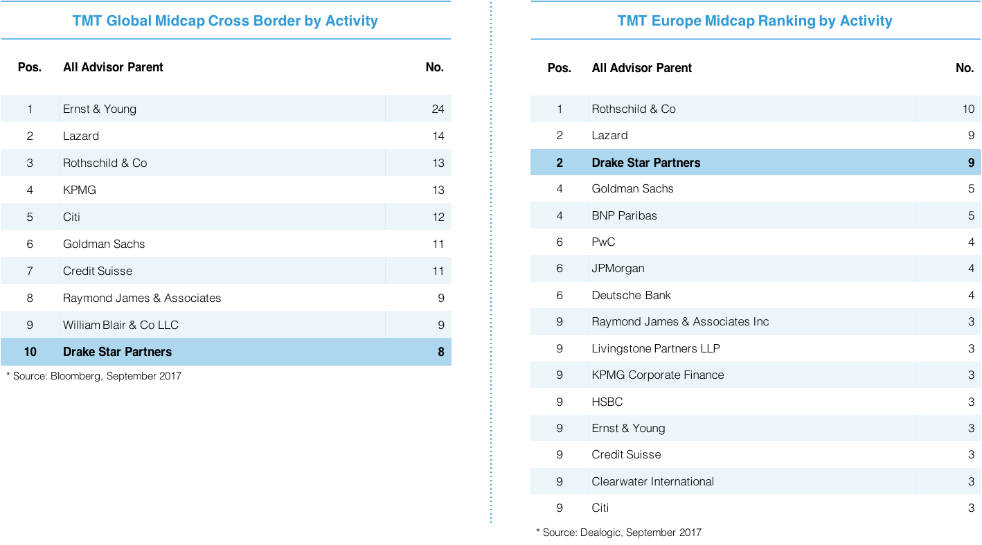 Technology, Media and Communications (TMC) global investment bank Drake Star Partners announced today that it ranks 10th in TMT Global Midcap Cross Border by Activity (source: Bloomberg) and 2nd in TMT Europe Midcap Ranking by Activity (source: Dealogic) in 2017 year to date.